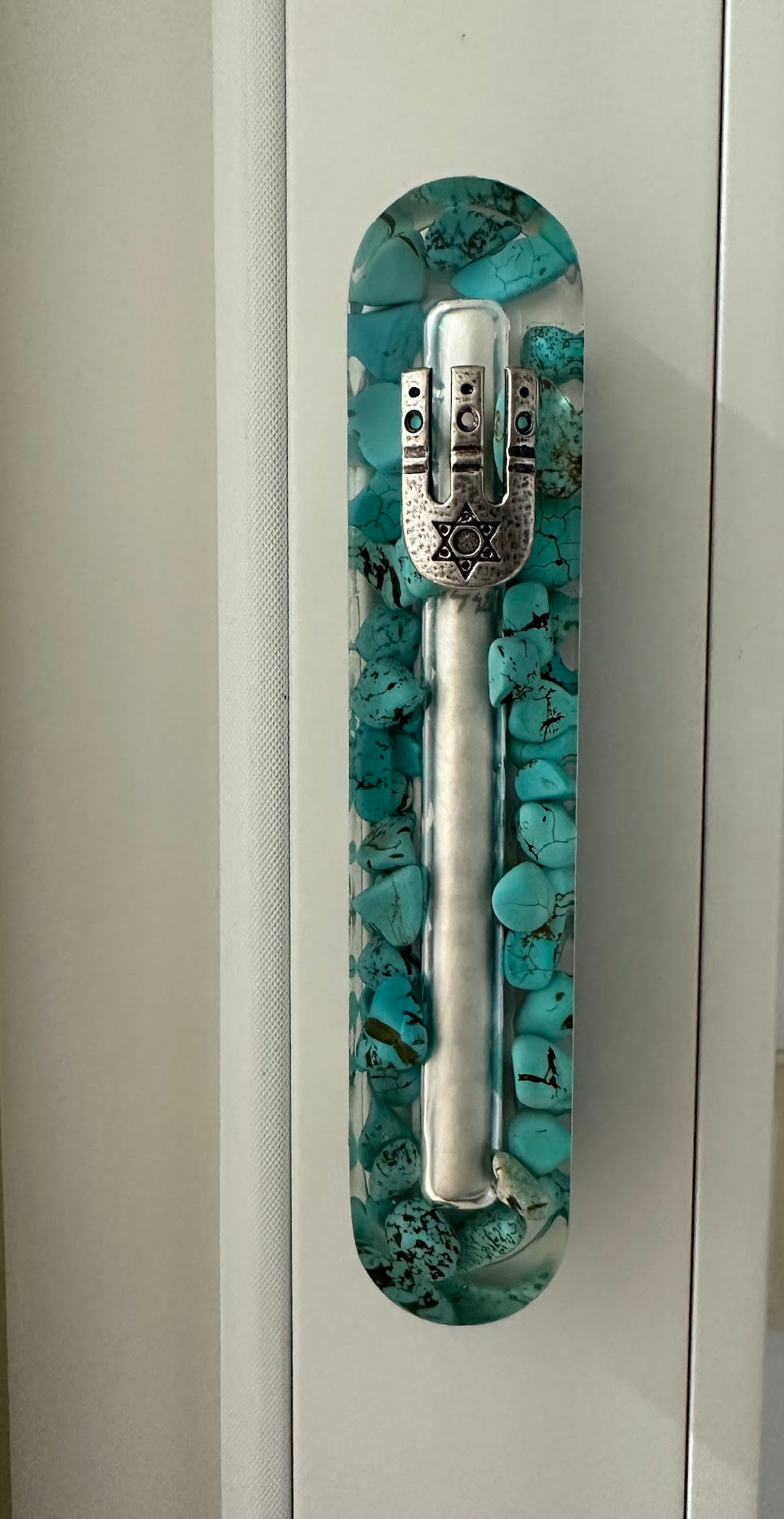 מזוזה עגולה מאפוקסי שקוף וקריסטלי- מבריק, חלק ונוצץ.מילוי: אבן טורקיז בצורות אמורפיות שונות ובאיכות גבוהה.גודל: 19X3 ס”מ